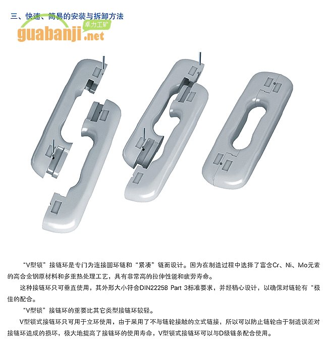 特別設(shè)計用來垂直鏈接圓環(huán)鏈或緊湊型礦用鏈的v鎖式接鏈環(huán),比DIN標(biāo)準(zhǔn)2級質(zhì)量高出10%以上的強(qiáng)度。